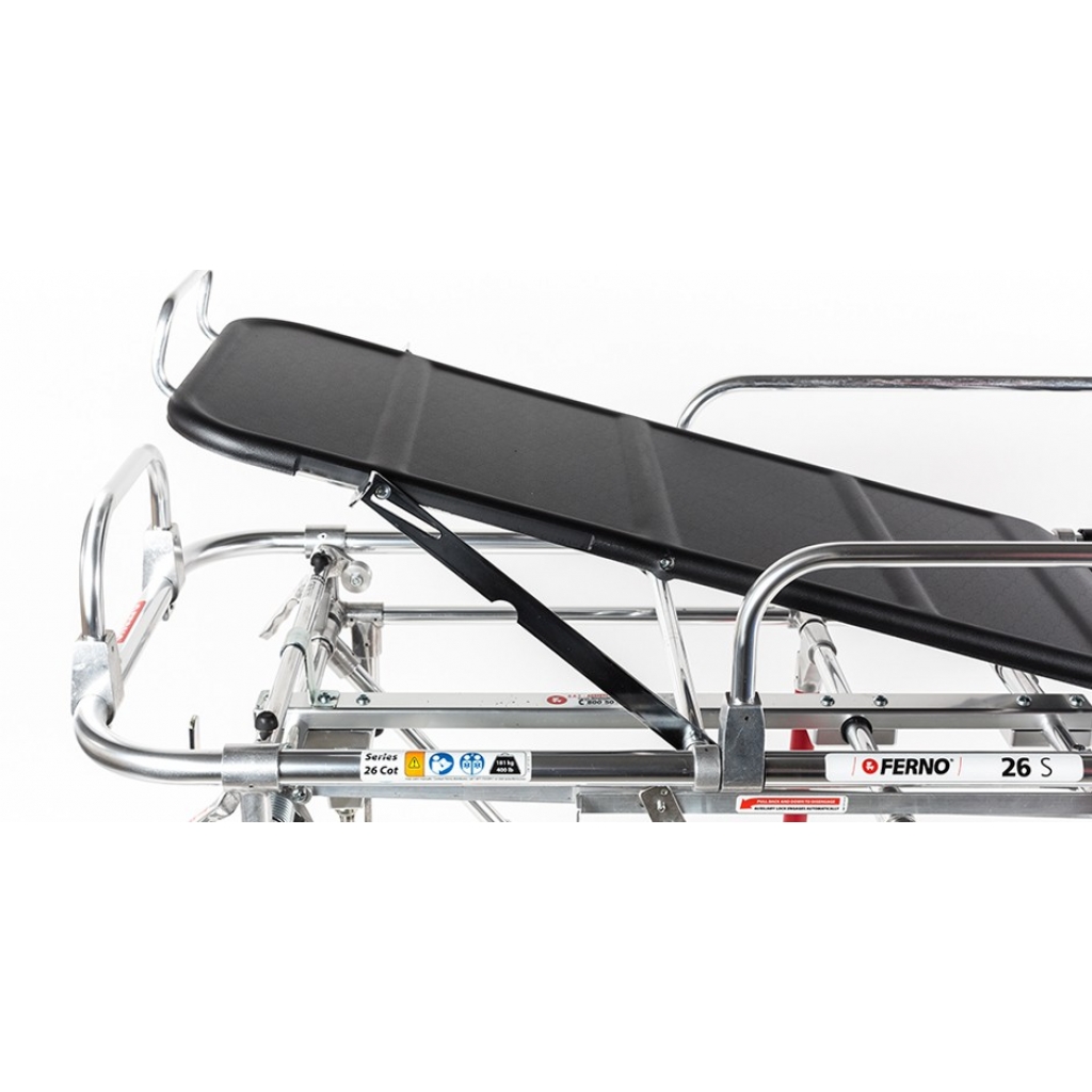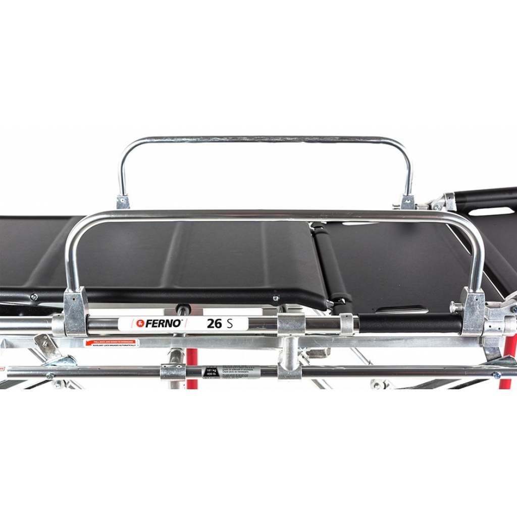 Facilita le manovre di soccorso. La barella 26-S è dotata di un telaio antishock per mettere il paziente nella posizione di Trendelenburg. Spondine abbattibili e piani rigidi in ABS permettono di eseguire tutte le manovre salvavita.